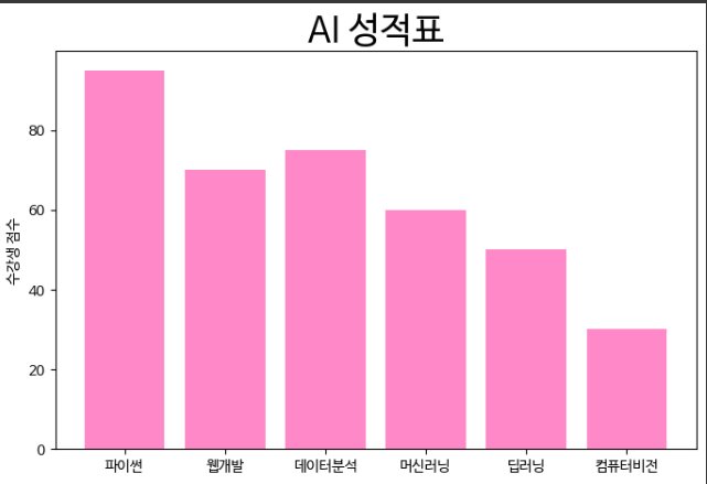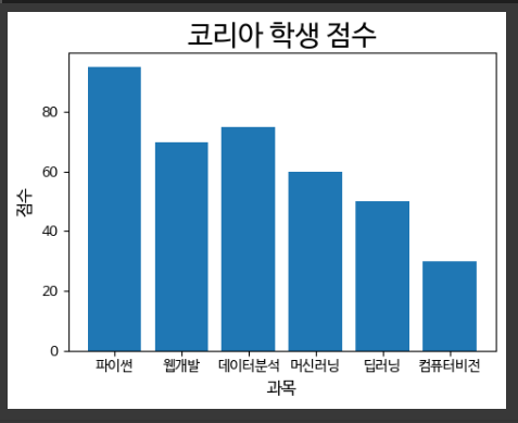 df = pd.DataFrame({"과목":x, "점수":y}) # 딕셔너리를 사용하여 과목과 점수를 열로 하는 데이터프레임을 생성